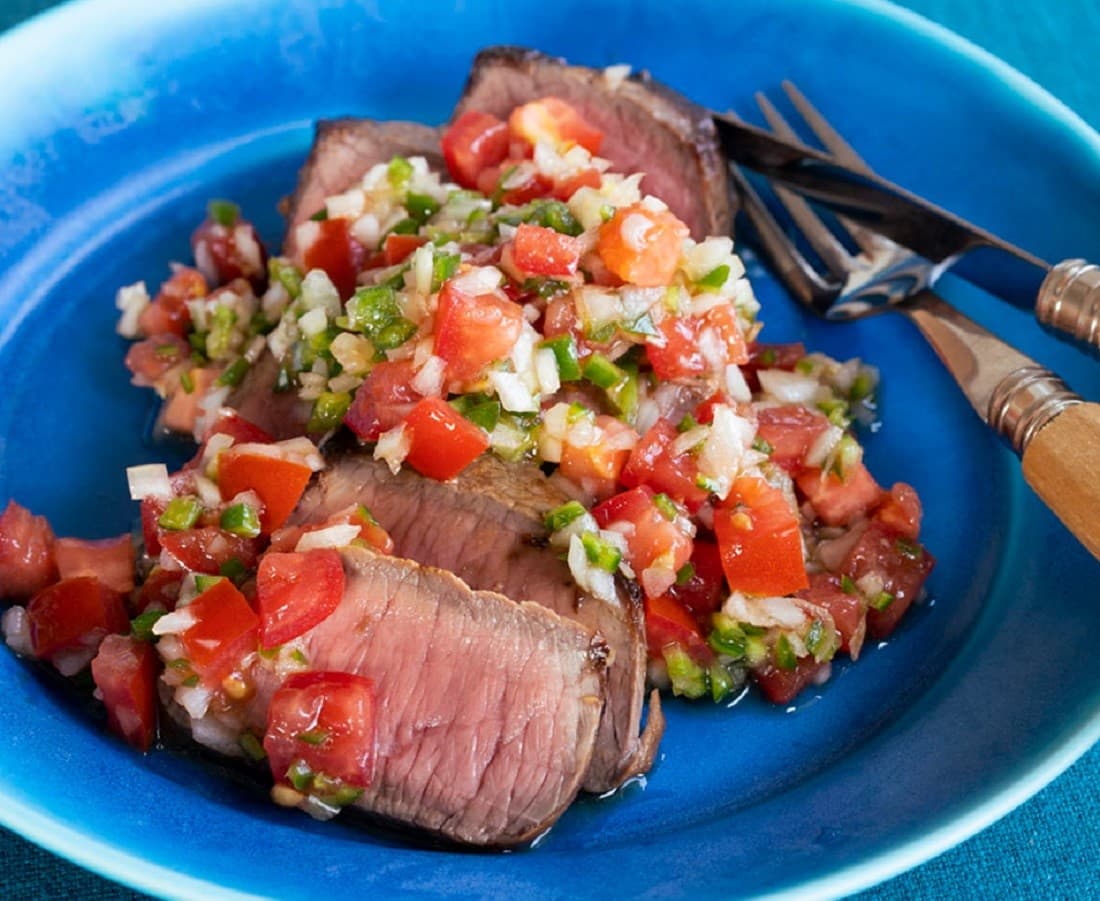 3.牛肉をバットなどに取り出して、3分ほど休ませます。その後、食べやすい大きさに切り、器に盛って、サルサソースをかけたらできあがりです。