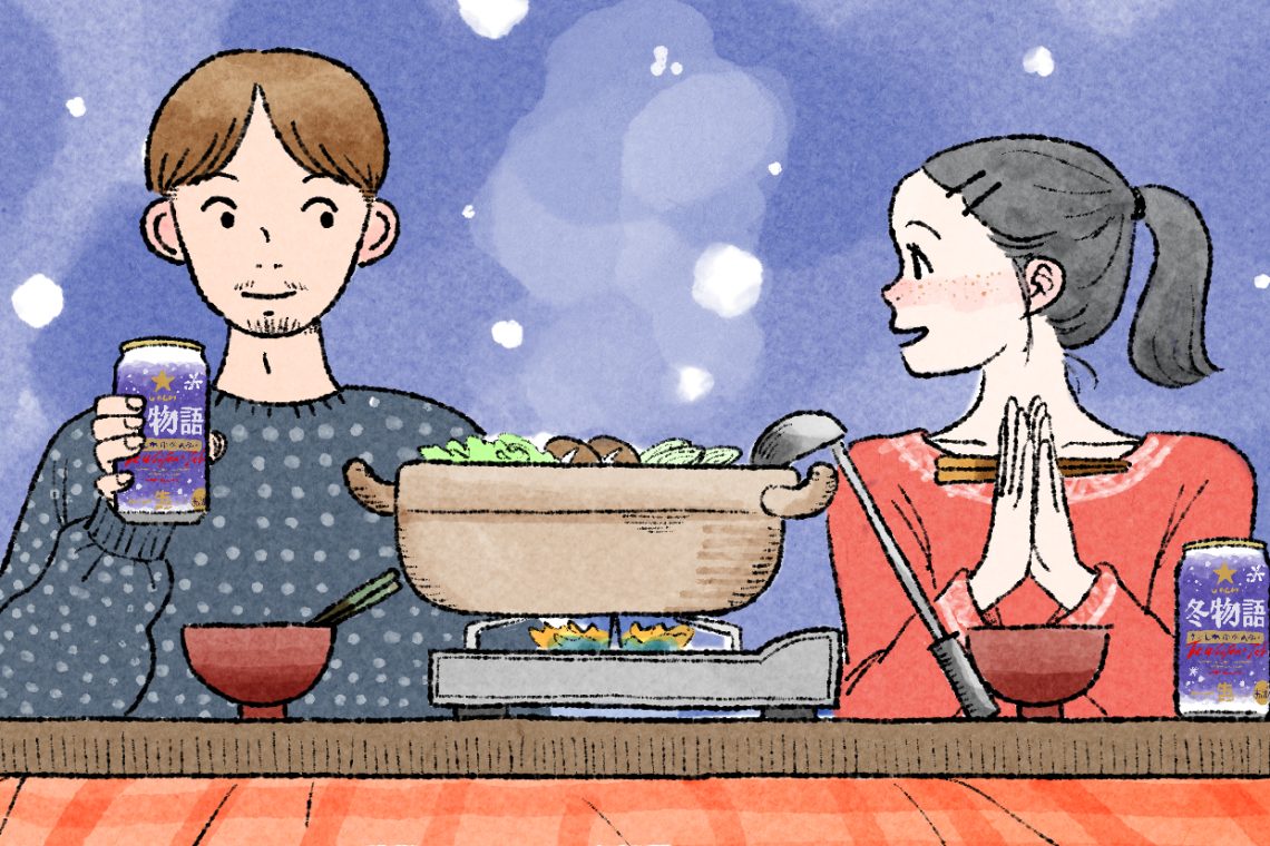 ぬくぬくのこたつ、湯気が立ち上るお鍋。そして、冬らしいパッケージを纏った「冬物語」。