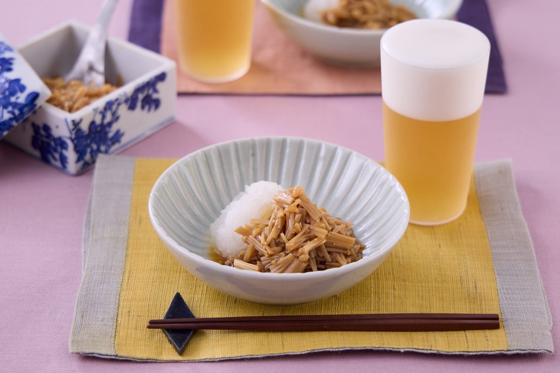 きのこの佃煮のようなものなんだけど、電子レンジなら手軽で、作ってみようと思えるでしょ。大根おろしと一緒に食べるのもおいしいから、酒のつまみにも合うよ。