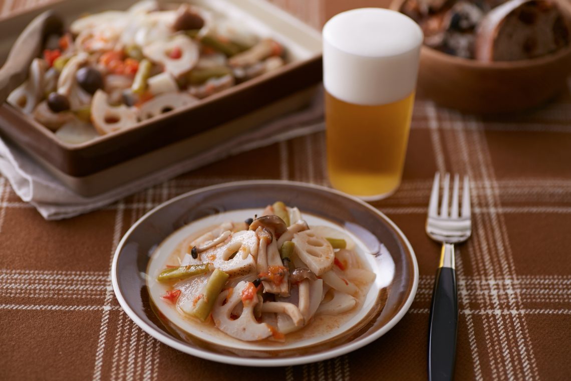 きのこと根菜のトマト味重ね煮