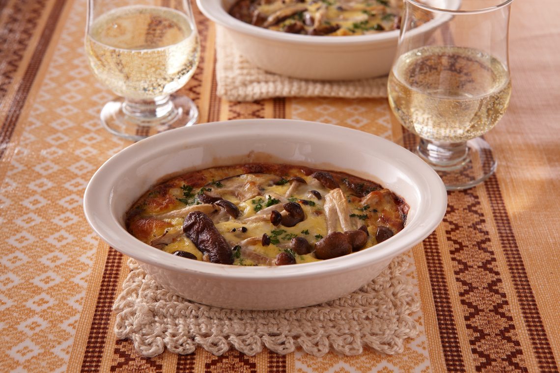 卵液に炒めたきのこを混ぜて焼くだけだから、グラタン感覚で作れるよ。