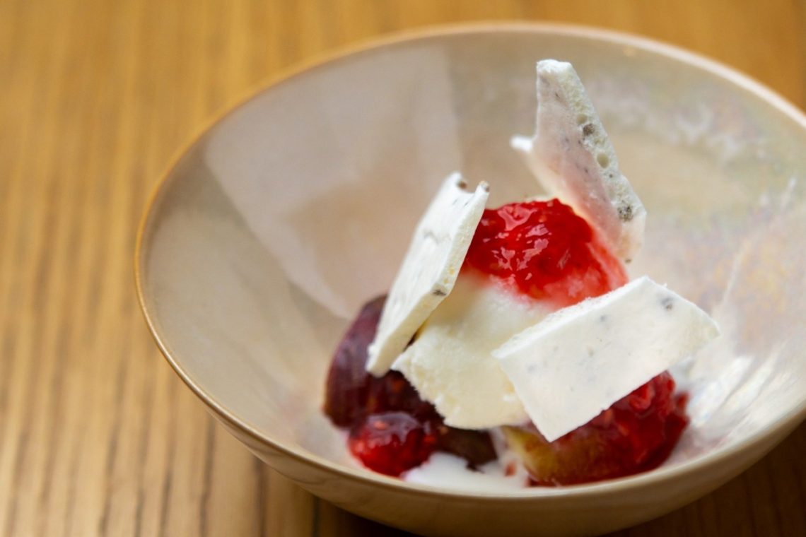 「無花果を使ったデザートです。薔薇のアイスクリームに、フランボワーズと薔薇のソースをかけています。上に乗っているのは、ローストしたエゴマを練り込んだメレンゲです。無花果のプチプチした感じ、エゴマのプチプチした感じ、ラズベリーのプチプチした感じ、3つのいい感じのプチプチを楽しんでください(笑)。」(中村シェフ)