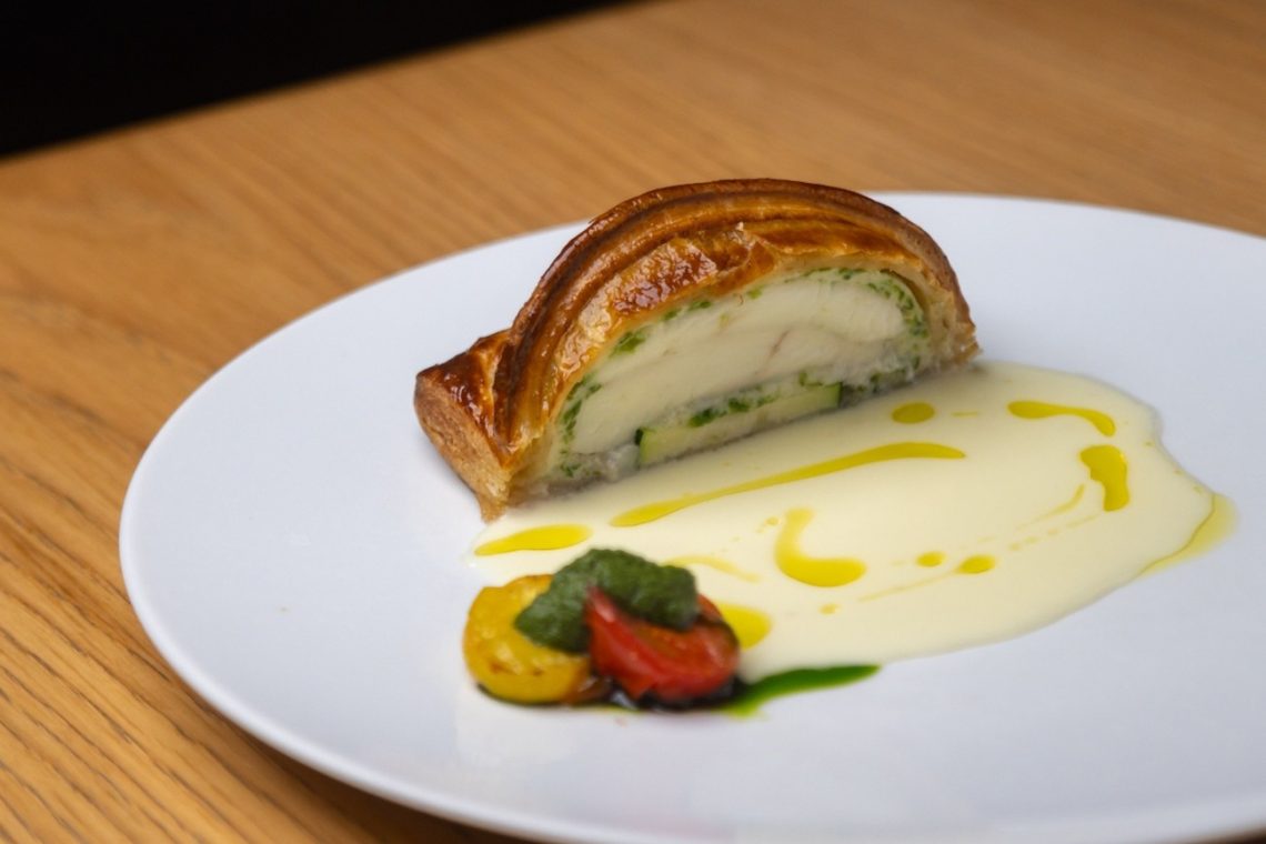 平目のパイ包み、帆立貝と青海苔のムース、ズッキーニ、サムライガーリックとジャガイモのソース