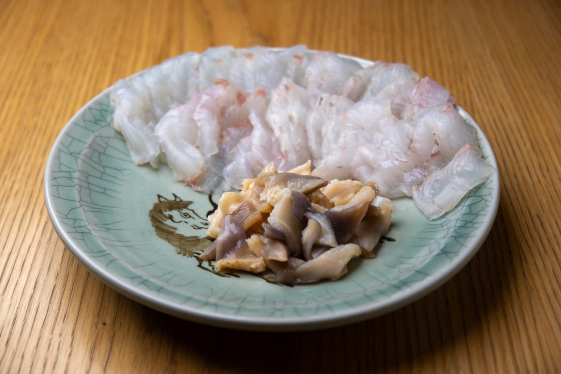 さて、本日の目玉である請戸ものを用いたお料理ですが、まずはコース外の前哨戦とでも言うべき一皿、平目(ヒラメ)とホッキ貝のお刺身が提供されました。請戸ものの素材としての魅力をダイレクトに知ってもらうための一皿です。