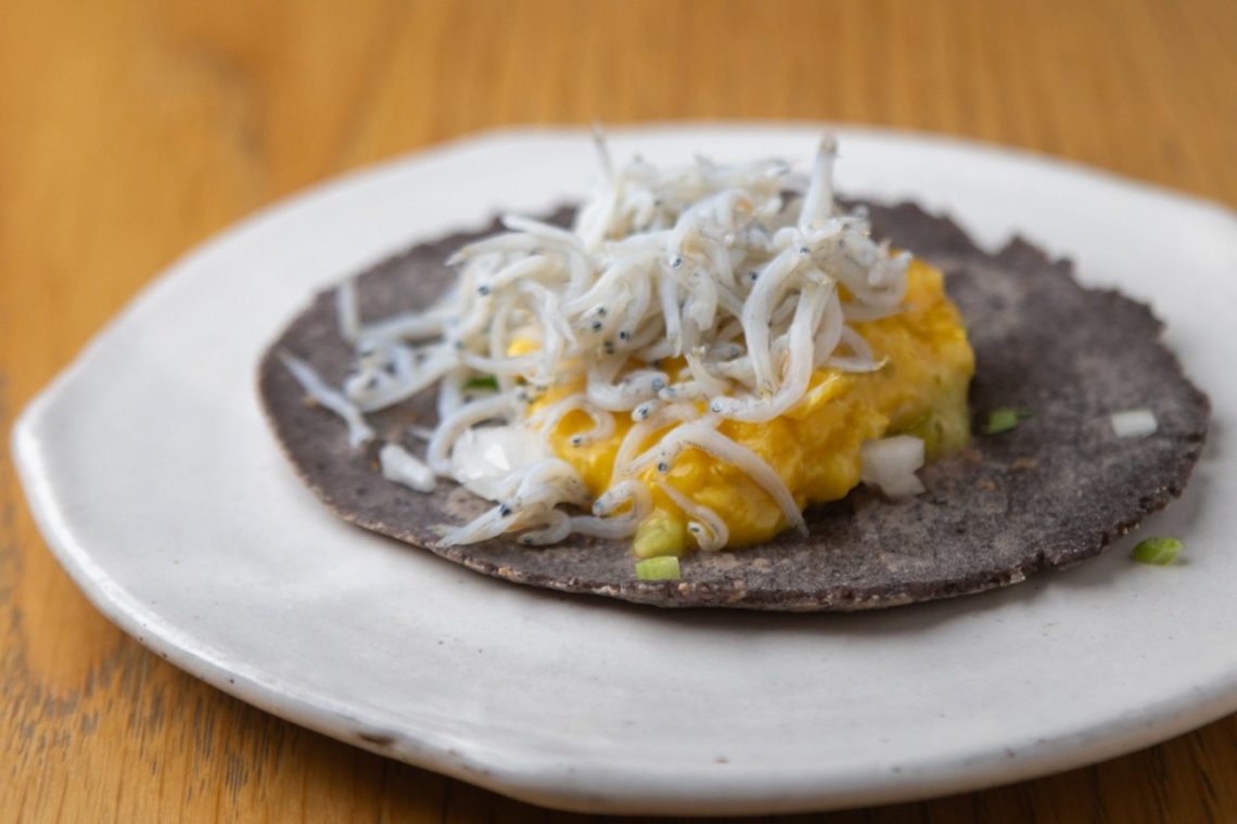 シラス干し、青とうがらしのスクランブルエッグ、玉葱のタコス、焼き茄子と黒ニンニクのモーレ