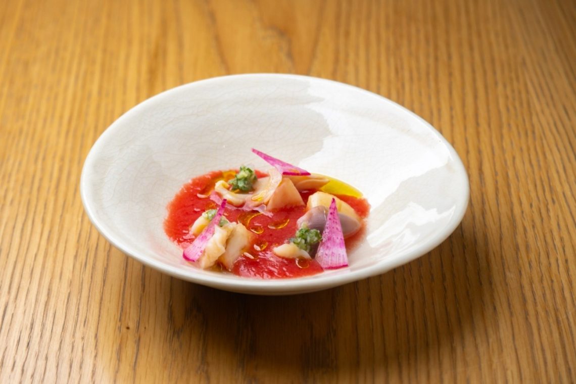 ホッキ貝と桃のガスパチョ、胡瓜のサルサヴェルデ、オリーブオイル