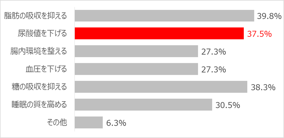 すると、週1回以上のペースでお酒を飲む人のうち、「尿酸値を下げる」と回答した方の割合は30.0%、男性に限れば実に37.5%にものぼるという結果が出ています。
