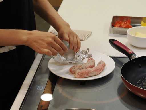手作りソーセージと聞くと、塩漬けの羊腸にひき肉を詰めたりと、「大変そう!」とか、「小さい子にもできるの?」なんてつい思ってしまいますが、心配はご無用。羊腸のかわりにアルミホイルでひき肉を包んで成形するので、誰でも手軽に作れるようにアレンジされたレシピになっています。この日の料理教室は午前と午後の2回にわけて行われ、どちらの回も同じ構成にすることで、どちらに参加しても同じように楽しめる工夫がされていました。