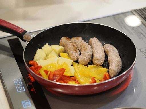 ここからはアルミホイルを外したソーセージをフライパンで直接焼いていくのですが、このときに、フライパンの余ったスペースで付け合わせの野菜も一緒に焼いてしまうのがポイント。当日の教室では、赤と黄、2色のパプリカ、そして一口サイズに切ってから電子レンジで10分ほど加熱したジャガイモを焼いていましたが、お好み次第でどんな野菜でもOKです。