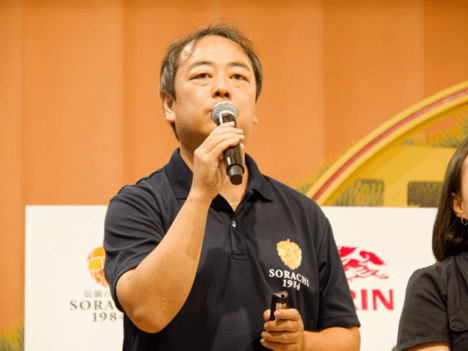 記者発表会で進行役を務めたSORACHI 1984のブリューイングデザイナーの新井健司。国産ホップの現状や、ソラチエースが世界的に広まっていく様子などを来場者に解説しました。