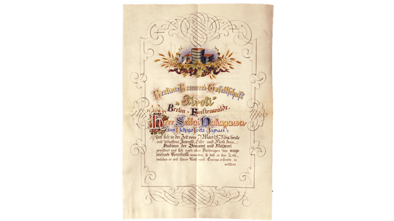 そして1875年5月、清兵衛は2年2か月に及ぶ修業を終え、ベルリンビール醸造会社から修業証書を授与されたの。