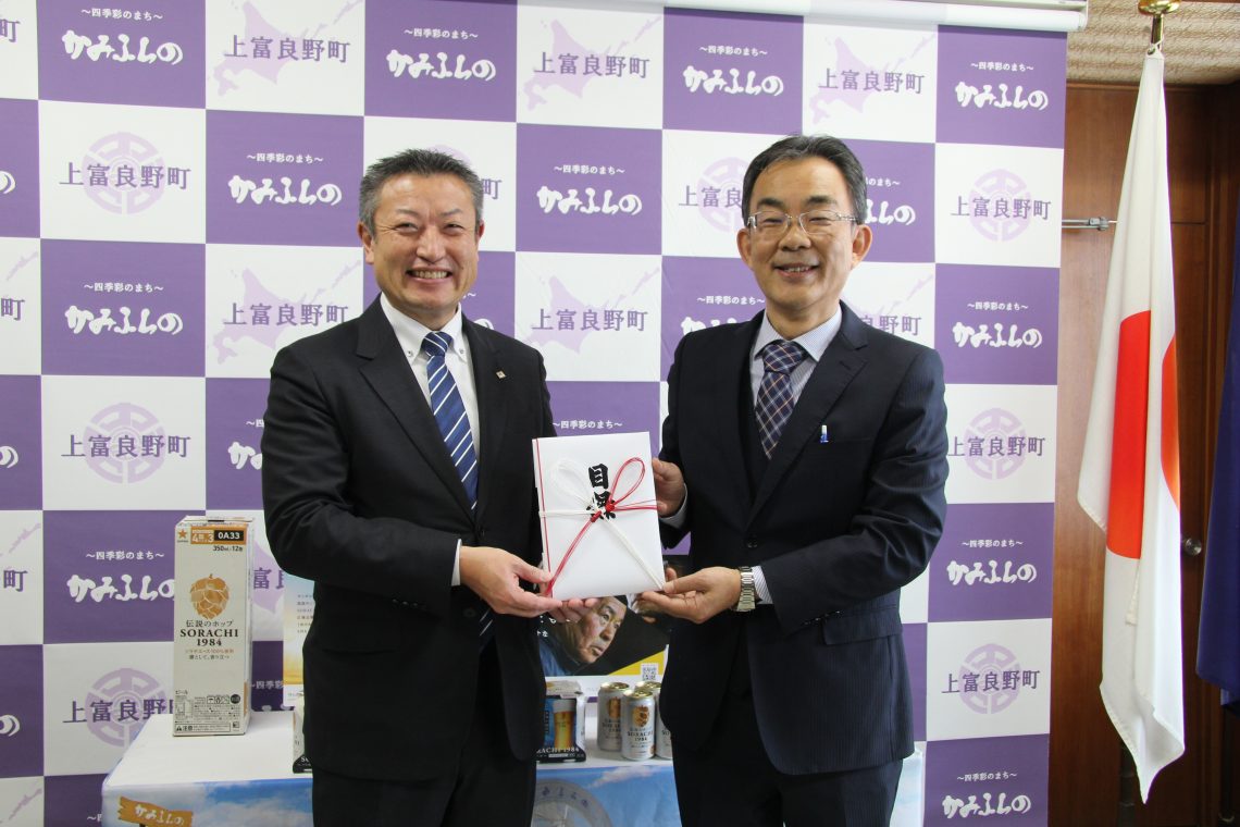 寄付金額は513,060円となり、上富良野町・岩手県北ホップ農業協同組合にそれぞれ256,530円を寄付させていただきました。改めまして協力企業及び、SORACHI 1984をご購入いただきました皆様に感謝申し上げます。当企画をきっかけに更に連携を強化してまいりたいと思います。