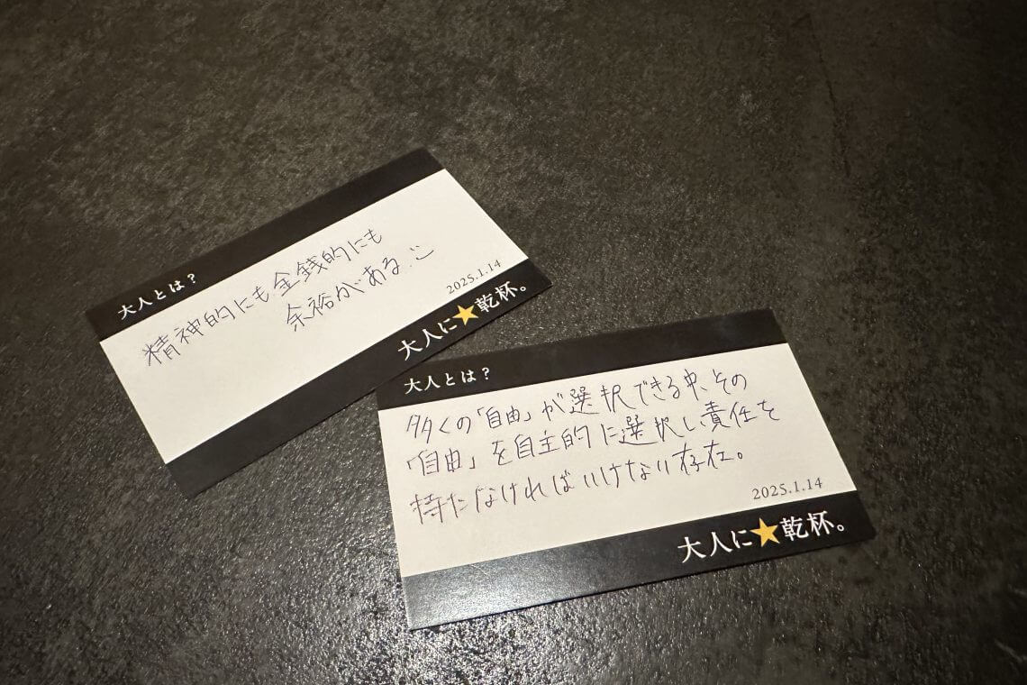 お酒も進み、参加者とサッポロビール社員の会話も弾んでいきます。一部参加者の方の「大人とは?」をご紹介します。