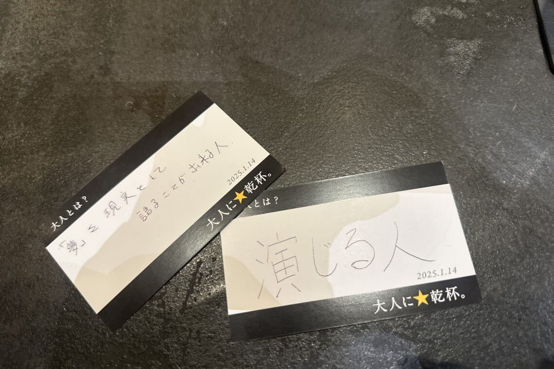 黒柳・牛之濵はじめ、参加していた社員メンバーも参加者に交じり「最近大人になったと感じたことは?」「いま、挑戦したいと思っていることは?」などを会話しながらカードにペンを走らせていきました。