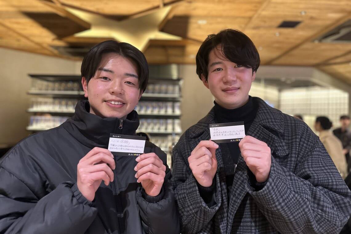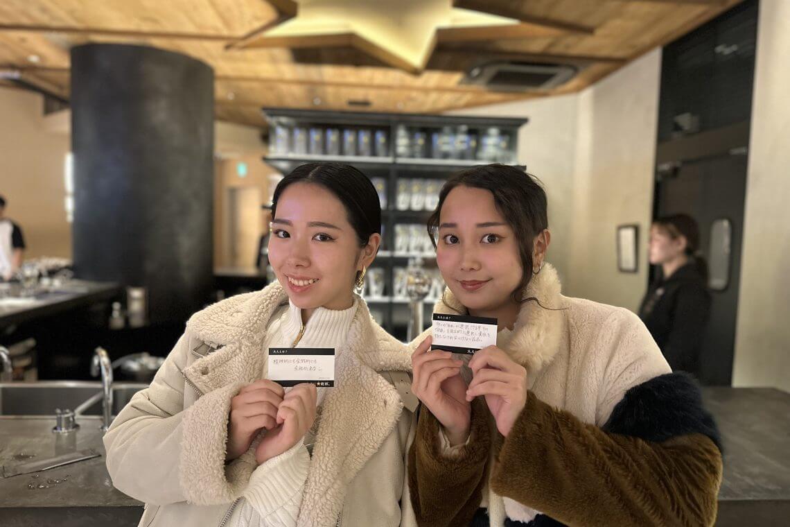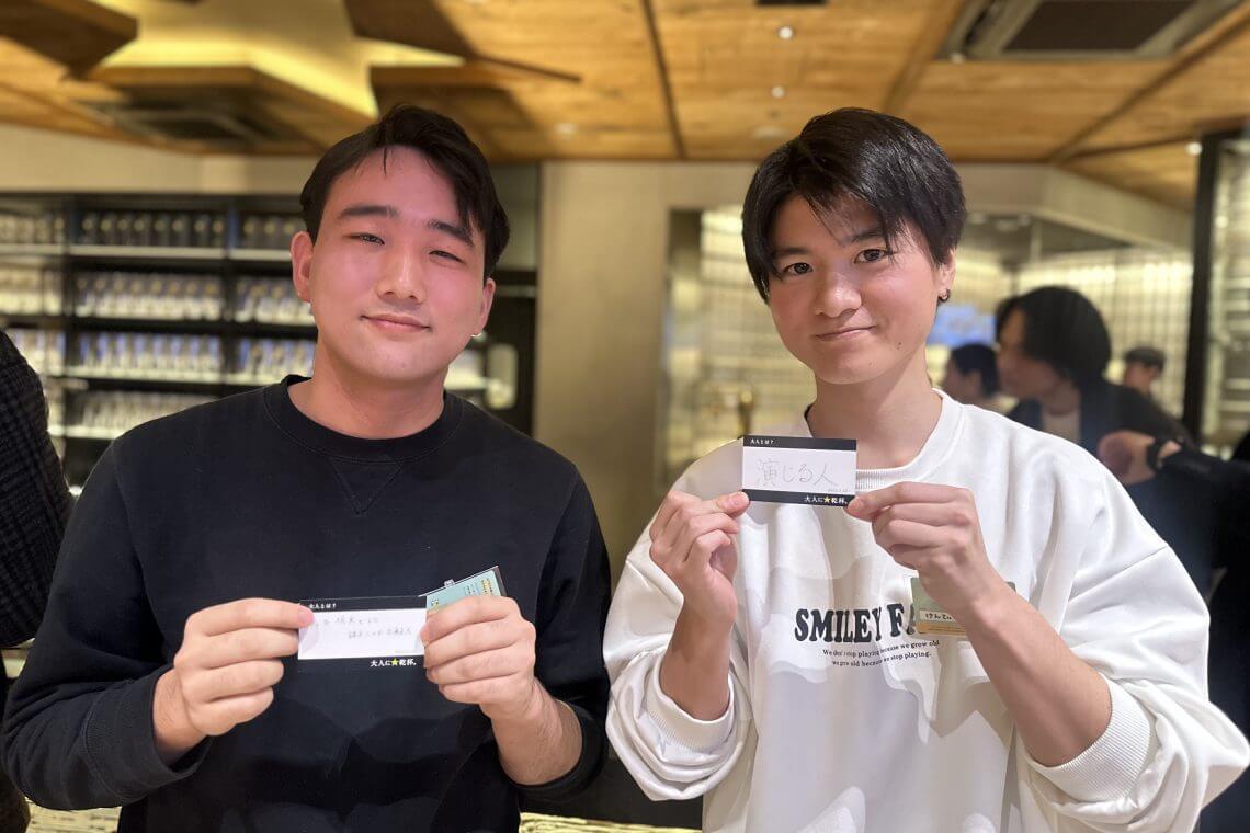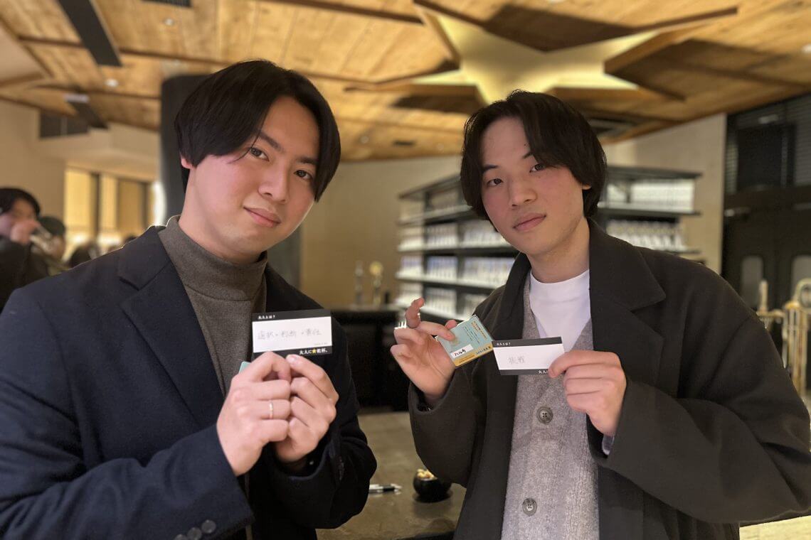 本イベントの参加者は全員20代前半の大学生で、前日13日に成人式を迎えた方もいました。ありがたいことに普段から黒ラベルを選んでいただいている方も多い中、参加者全員がTHE BARへのご来店は初めてとのことでした。そんな方たちをご招待できたことに喜びを感じながら、黒ラベルブランドマネージャー黒柳 真莉子とTHE BAR担当 牛之濵 容(うしのはま いるる)がイベントを進行していきます。