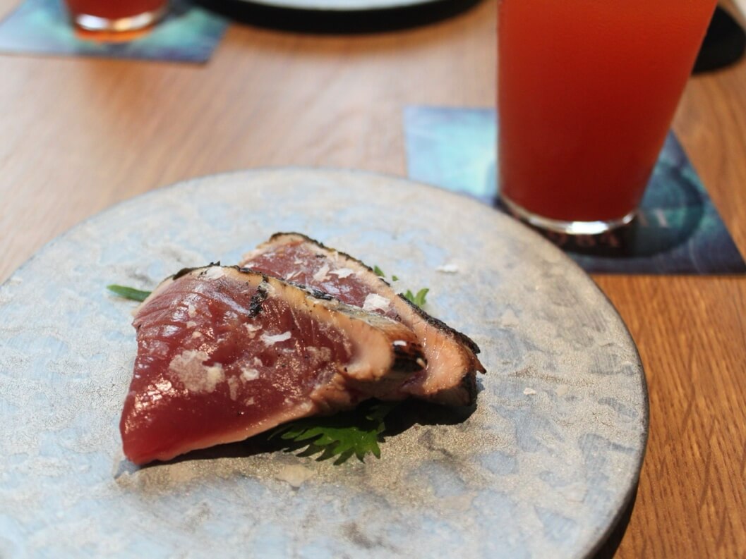 グラスを傾けると白だしと柚子ポン酢の爽やかな香りが広がり、後から七味と胡椒のスパイシーさが追いかけてきます。多層的な味わいでありながら、SORACHI 1984が全体を優しく包み込んでいるのが印象的です。カツオとの組み合わせについては、魚の脂質とカクテルの酸味が調和し、一方で七味と胡椒が味わいに心地よいアクセントを加えています。