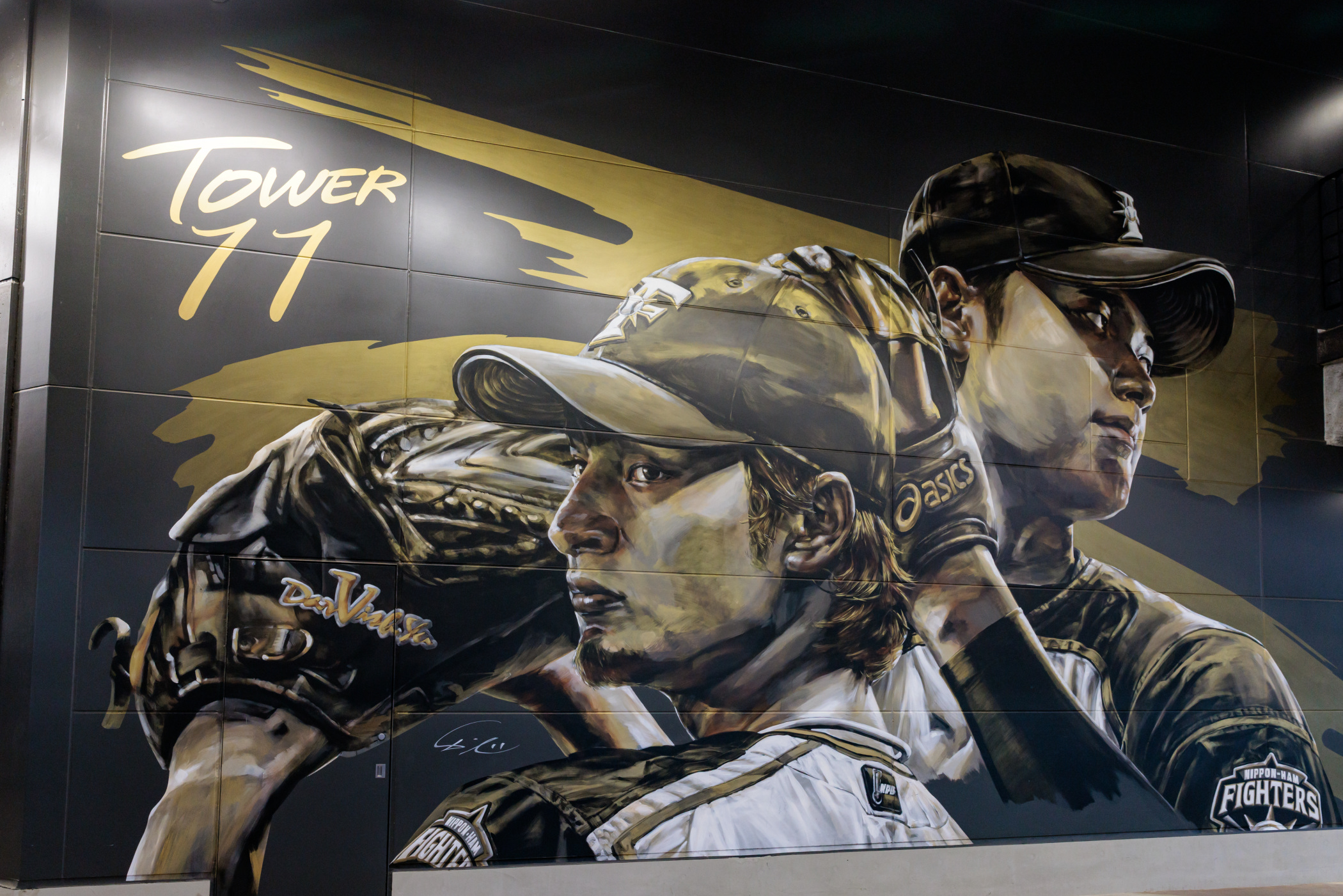 エスコンフィールドの中でも特に象徴的なランドマーク。それがレフトスタンド側にそびえ立つ「TOWER 11」です。この「11」という数字には、深い敬意が込められています。かつてファイターズの背番号11を背負い、世界へと羽ばたいたダルビッシュ有投手と大谷翔平選手。ふたりの功績を称えて共通の背番号から命名されました。エリア内には、そんなレジェンドたちの姿を描いた巨大な壁画も展示されており、フォトスポットとなっています。
