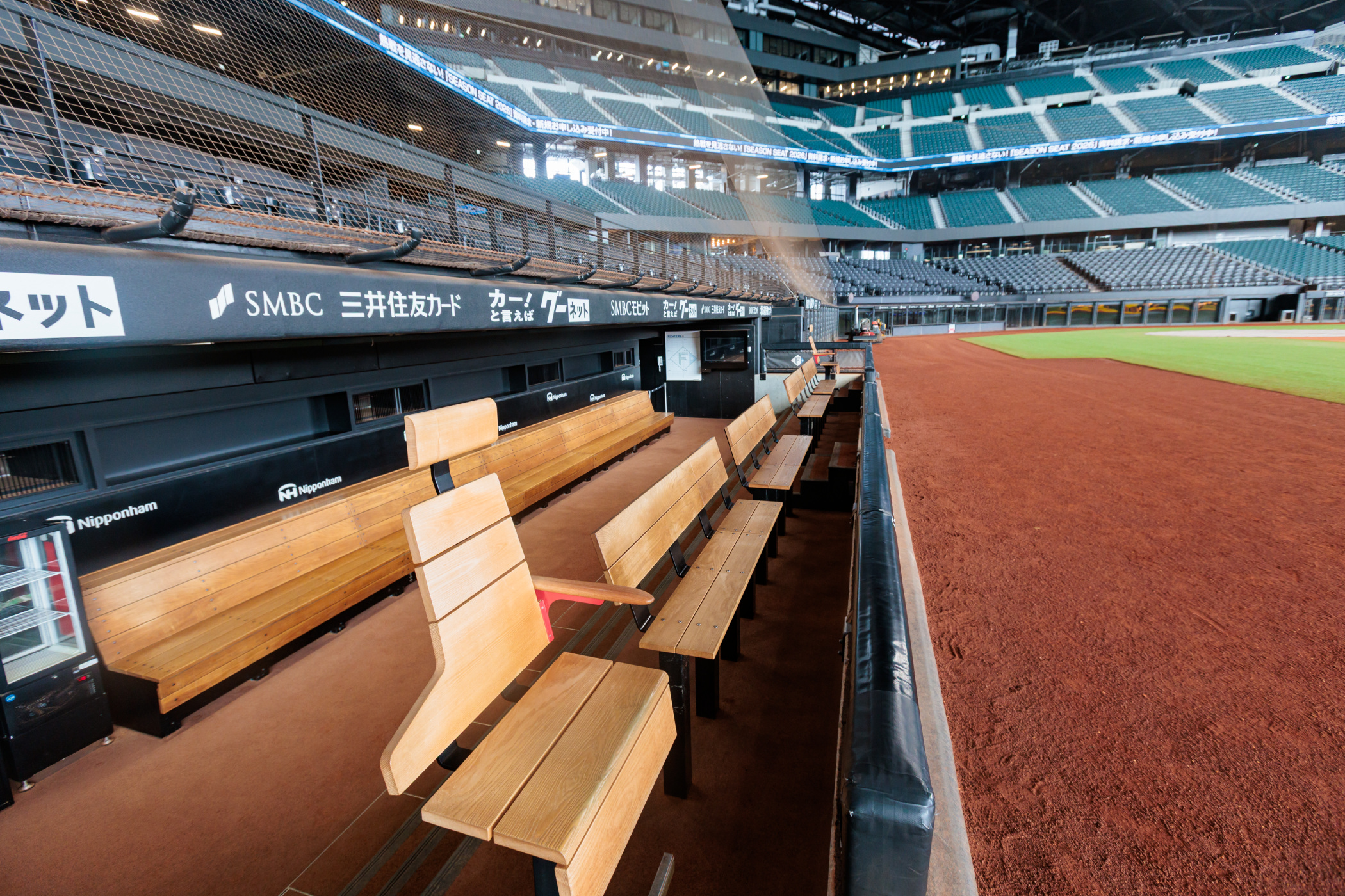 他には、インタビューエリアを見学したり、グラウンドを歩いたり、選手が使用するダグアウト(ベンチ)に実際に座ったりすることができました。ちなみに、ダグアウトで使われている木材は北海道産で、冬場を考慮して暖房が完備されているとのこと。