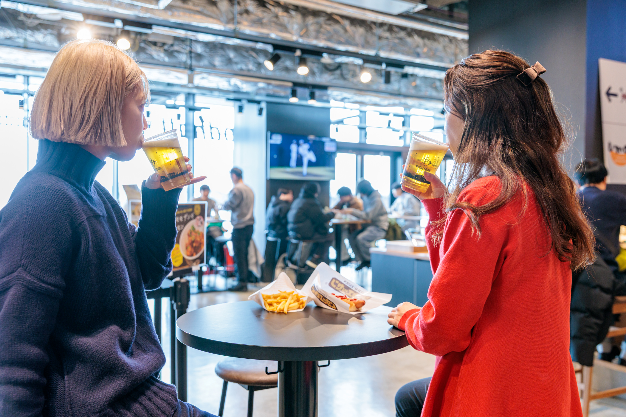 ここからはいよいよ、「サッポロ クラシック」を楽しめるスポットを紹介します。最初に向かったのは、「TOWER 11」エリアの1階にあるフードホール。このホール内ではすべての店舗で「サッポロ クラシック」が提供されています。開放感あるホール内の座席でゆったり味わうのはもちろん、観戦席に座り熱気の中で楽しむのも最高です。